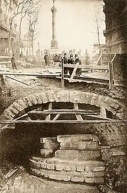 The area around the Bastille was transformed in the reign of Louis XIV. Paris' growing population reached 400,000 during the period, causing the city to spill out past the Bastille and the old city into the arable farmland beyond, forming more thinly populated faubourgs, or suburbs.[62] Influenced by the events of the Fronde, Louis XIV rebuilt the area around the Bastille, erecting a new archway at the Porte Saint-Antoine in 1660, and then ten years later pulling down the city walls and their supporting fortifications to replace them with an avenue of trees, later called Louis XIV's boulevard, which passed around the Bastille.[63] The Bastille's bastion survived the redevelopment, becoming a garden for the use of the prisoners.[64]