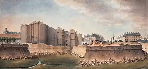 The number of prisoners held in the Bastille at any one time declined sharply towards the end of Louis's reign. It contained ten prisoners in September 1782 and, despite a small increase at the beginning of 1788, by July 1789 only seven prisoners remained in custody.[167] Before any official scheme to close the prison could be enacted, however, disturbances across Paris brought a more violent end to the Bastille.[157]