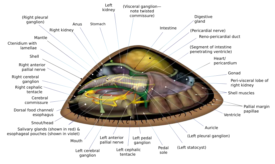 The pedal ganglia are located low and close together in the back of the head region, with the more widely spaced pleural ganglia positioned slightly forward of them and above. Each pedal ganglion gives off a broad pedal nerve cord that runs the length of the animal's body beneath the visceral mass and together control its foot and shell muscle bundles. Each of the pleural ganglia connects to a statocyst that allows the limpet to orient itself. The pleural ganglia also innervate the pericardium (via the pericardial nerve cord) and the visceral ganglion, as well as the anterior and posterior sets of pallial nerves which travel through the mantle and surround the animal's head and sides respectively.[2]