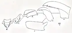 The radula is short, with a rather restricted number of uncini, and the shape of the teeth agrees with that of the known species. The rhachidian tooth has a subquadrate body, narrower in front, with a concave upper and convex basal margin. Its cusp is large, longer than the base, with about 4 to 6 denticles on each side of the median denticle. The first lateral has a subquadrate body. Its cusp has very small denticles, at its proximal, more conspicuous ones at its distal margin. The second lateral has a similar body, with a larger cusp and more numerous denticles at its distal margin. The body of the third lateral is elongate, with a moderate cusp and only a few denticles. The fourth has a very large cusp, with about 10 small denticles and a rhombic body. Moreover, I see a fifth lateral without a cusp. Perhaps this tooth exists in many or all the species, but it is so much covered by the other teeth in their normal position, that it may be easily overlooked. The uncini are not very numerous, and as far as I can see, they have simple cusps.[3]