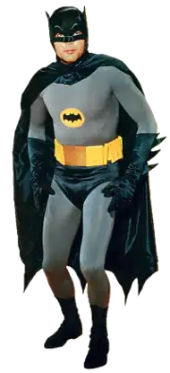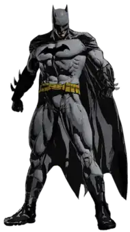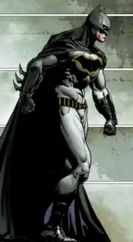 The Batsuit (or Bat-Suit) is a fictional tactical costume worn by the fictional superhero Batman, which appears in comics published by the American company DC Comics, and related media. The suit has been depicted in various artistic iterations, and the stories themselves have described Batman as modifying the details of his costume from time to time typically using military and SWAT standards materials and technology that evolved into an advanced combat suit. However, it usually consists of a gray body suit, the chest emblazoned with a stylized black bat either with or without a yellow ellipse around it, and either blue or black accessories: a wide scalloped cape, gloves with a series of fin-like projections, trunks, boots, and a close-fitting cowl (covering the upper half of his face) with ear-like projections to suggest a bat's head; and a yellow utility belt containing a variety of gadgets.