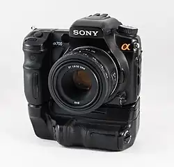 A battery grip (aka battery pack) is an accessory for an SLR/DSLR (and occasionally other cameras), which allows the camera to hold multiple batteries to extend the battery life of the camera, and adds a vertical grip with an extra shutter release (and other controls), facilitating the shooting of portrait photography.[1] Some models may also feature a continuous shooting boost which increases the burst rate of the camera's shutter.