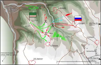 In late February 2000, the Russian military attempted to encircle and destroy a large Chechen force withdrawing from the Chechen capital Grozny to Shatoy and Vedeno in the southern mountains of Chechnya following the 1999–2000 siege and capture of Grozny.[7] On 29 February 2000, just hours after Russian Defense Minister Igor Sergeyev had assured his government that the Second Chechen War was over,[8] an isolated Russian force composed mainly of a company of paratroopers of the 76th Airborne Division from the city of Pskov found itself cut off by a retreating Chechen column led by Shamil Basayev and Ibn Al-Khattab.[9] After heavy close-quarters overnight fighting, the Russian position was overrun and almost entirely wiped out. The incident inspired a Kremlin-funded film, and fascinated Russian leader Vladimir Putin.[10]