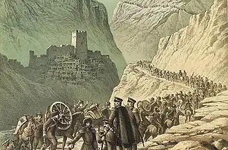By the end of the day, a significant part of Argvani still remained in the hands of the Murids, in particular, a tower of several tiers on the eastern tip of the village cost a bloody battle, where all the efforts of the assault teams were in vain. By evening, they managed to drag two mountain and two Cossack guns into the village and put them on the roofs of the nearest houses in order to make a breach in the tower.[4] In spite of everything, the highlanders did not give up, at night they took the most stringent measures to completely encircle the village, especially those huts in which the enemy was still. At night, the surviving murids began to leave Argvani, some of them engaged in hand-to-hand combat with the chains of rangers, others in the dark, by negligence, fell off the cliffs into a precipice. Few managed to leave the village.[3]