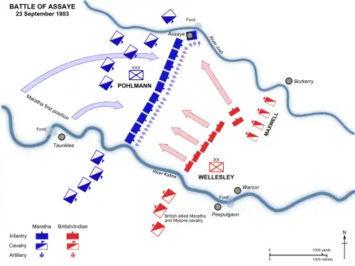 At around 15:00, the British crossed to the northern bank of the Kaitna unopposed apart from a distant harassing fire from the Maratha cannon which was largely inaccurate but succeeded in decapitating Wellesley's dragoon orderly.[35] Once across, Wellesley ordered his six infantry battalions to form into two lines, with his cavalry as a reserve in a third. His allied Maratha and Mysore cavalry were ordered to remain south of the Kaitna to keep in check a large body of Maratha cavalry which hovered around the British rear. Pohlmann soon recognised Wellesley's intentions and swung his infantry and guns through 90 degrees to establish a new line spread approximately 1 mile (1.6 km) across the isthmus with their right flank on the Kaitna and the left on Assaye.[36] Although the new position secured the Maratha flanks, it restricted Pohlmann from bringing his superior numbers into action.[37]