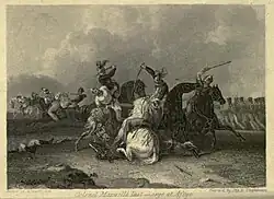 In the northern sector of the battlefield however, Wellesley's right flank was in turmoil. The commander of the pickets, Lieutenant Colonel William Orrock, had mistaken his orders and continued his oblique path directly towards Assaye.[45] Major Samuel Swinton of the 74th Regiment was ordered to support the pickets and followed close behind. This created a large gap in the centre of the British line and brought the two battalions under a barrage of cannonade from the artillery around the village and the Maratha left.[47] The two battalions began to fall back in disarray, and Pohlmann ordered his remaining infantry and cavalry forward to attack. The Marathas gave no quarter;[48] the pickets were virtually annihilated, but the remnants of the 74th were able to form a rough square behind hastily piled bodies of dead.[49] Realising that the destruction of his right would leave his army exposed and outflanked, Wellesley ordered a detachment of British cavalry under Colonel Patrick Maxwell, consisting of the 19th Light Dragoons and elements of the 4th and 5th Madras Native Cavalry, into action.[47] From their position at the rear, the cavalry dashed directly towards the 74th's square, crashed into the swarming attackers and routed them. Maxwell pressed his advantage and continued his charge into the Maratha infantry and guns on the right, driving them backwards and across the Juah "with great slaughter".[50][51]