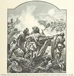 A number of Maratha gunners who had feigned death when the British advanced over their position re-manned their guns and began to pour cannon fire into the rear of the 74th and Madras infantry.[45] Wellesley ordered his four sepoy battalions to re-form and ward off any threat from the Maratha infantry and cavalry while the 78th were sent back to retake the Maratha gun line.[52] Wellesley, meanwhile, galloped back to 7th Madras Native Cavalry, which had been held back in reserve to the east, and led a cavalry charge from the opposite direction.[53] The gunners again stood their ground but were eventually driven from their guns and this time it was ensured that all those who remained were dead.[54]