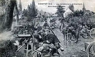 At about the same time fighting took place in Campine between the Germans and the 4th Volunteer Regiment, which was composed of recruits. The regiment occupied the camp of Leopoldsburg (Beverloo) and cleared the countryside of German scouting parties. The presence of the volunteers in the Limburg district caused much local disruption to the Germans and on 20 September there was an engagement at Schaffen-lez-Diest between four companies of volunteers and Germans troops.[5] The recruits resisted German attacks for nearly three hours and retreated when the Germans began to envelop their right flank. Another skirmish occurred at Lummen, where over fifty houses were fired by the Germans. A company of volunteers held the bridge over the canal at Beeringen, against much larger forces advancing from the direction of Heusden and Pael. All volunteer companies were sent as reinforcements during the night to Heppen, Beverloo, Beringen, Oostham and Tessenderloo.[6]