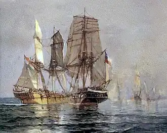 The Chilean squadron, commanded by Roberto Simpson, consisted of Confederación (22 guns), Santa Cruz (20 guns) and Valparaíso (20 guns). It was taking on firewood in Casma Bay when it was attacked by the privateers. The more heavily built Chilean ships inflicted heavy casualties on the privateers and captured the Arequipeño. Blanchet was among the killed. The other privateer ships escaped while flying French flags but were intercepted by a French warship; the privateer squadron was subsequently disbanded. Both sides claimed victory.[1] The Chileans gained naval supremacy in the southeastern Pacific. As a reward, Simpson was promoted to the rank of Commodore in the Chilean navy in May 1839.[2][3]