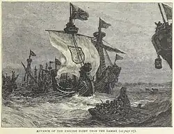Contemporary chronicler William the Breton, the royal chaplain, who was in the French camp at the time, reported the French fleet as numbering some 1,700 ships.[11] This number is considered improbably high by modern historians, who simply describe both fleets as "large". F. W. Brooks describes the figure of 1,700 ships for the French as "hopelessly exaggerated"[12] and suggests that the actual size was less than 500, but of unknown breakdown between fighting ships and transports.[12] Better figures are available for the English. In 1206 fifty galleys were recorded in royal service, operating in four squadrons. In 1211 there is a record of a fleet of over fifty ships, including twenty galleys. Building and maintaining fleets of this size was extremely expensive. In 1212 the fleet was costing over £3,500 per year; perhaps a quarter of the total royal revenue.[13] For the 1213 campaign John attempted to requisition every English merchant ship capable of carrying six or more horses.[14] 19th century historian Smedley estimates the English fleet at 500 ships;[4] 20th century historian Brooks that it was "much inferior in point of numbers to the French fleet".[15]