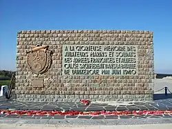 A marble memorial to the battle stands at Dunkirk. The French inscription is translated as: "To the glorious memory of the pilots, mariners, and soldiers of the French and Allied armies who sacrificed themselves in the Battle of Dunkirk, May–June 1940." The missing dead of the BEF are commemorated on the Dunkirk Memorial erected by the Commonwealth War Graves Commission.[52]
