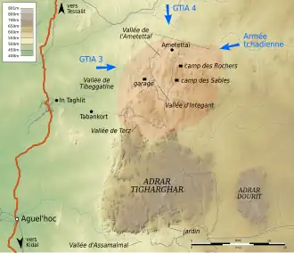 The evening of January 29, 2013, a flight of helicopters, including two Tigers, a Gazelle and four Puma reach Kidal airport and disembark 30 French soldiers of the CPA-10 and the Penfentenyo commando against MNLA pick-ups. They are followed by three planes landing men of 1 RPIMa and Commando de Montfort. The officer in charge of the French special forces then meets Colonel Mohamed Ag Najem, commander-in-chief of the MNLA's military wing. The French then settle in one of the two military camps of the city and begin their cohabitation with the Tuareg rebels, but unlike Gao, Timbuktu, and the southern cities where they had been celebrated as liberators, in Kidal the French are seen as the vanguard of the Malian army and the reception of the population is much colder.[5][6] But the goal of the French army, at that time, remains the Tigharghar . From the end of January, the surroundings of the Adrar are bombarded by Rafale. Then on the evening of February 2, a first mass air raid struck the interior of the mountain; four Mirage and four Rafale destroy twelve objectives, supported by three Atlantic, a Harfang drone, an AWACS and Tiger helicopters. The raid mainly targets the area known as the "Garage", west of Ametettai, where two BMP-1 armored vehicles have been located, as well as an anti-aircraft battery that was probably inoperative.[7][8] On 1 February, a column of fifteen vehicles of the MNLA and thirty men from the French Special Forces leave Kidal to conduct a joint operation towards the Adrar Tigharghar . The night of 2 to 3, the French and the Tuaregs separate. The first pursued towards the valley of Assamalmal, targeted a few hours earlier by the air strikes. On the spot, the balance sheet is rather thin, no body nor destroyed vehicle is discovered, only a stock of gasoline and some motorcycles were swept by the bombs. The Touareg rebels, meanwhile, take control of the town of Aguelhok where the French come back from Assamalmal to join them. The population, strongly hostile to jihadists, welcomes newcomers. The MNLA captured some suspects and discovered several hundred kilos of ammunition, which he then handed over to the French forces as a sign of goodwill.[9] France was also seeking the help of Chad's President Idriss Déby. He agreed to deploy his army in the Adrar of Ifoghas. On February 3, the first Chadian soldiers arrived in Kidal.[10] On the night of February 7 to 8, the French special forces lead Operation Takouba on Tessalit. Thirty men from the 13 th RDP, CPA-10, a marine CTLO and the ESNO are parachuted near the airport. They spot a piece of runway where two C-160 Transall can land and land four vehicles and a few more men. From Aguel'hoc, the 30 soldiers - mainly from the 1st RPIMa - who had led the reconnaissance mission in the Assamalmal valley are also moving on Tessalit. In the morning, the special forces make their junction and enter the city without encountering any resistance. A few hours later, from Kidal, the Chadians of General Deby arrived on their turn after passing through Aguel'hoc. Then, 54 soldiers of the 1st RCP are deposited by a third plane. Finally, a sub-GTIA party from Gao, consisting mainly of soldiers from 1 RIMa and forming a column of 90 vehicles, arrives at the scene and invests the military camp of Amachach.[11] On February 13, the Special Forces made a first foray into the Tigharghar during Operation Tazidert, whose goal is to find a record of the Western hostages held by AQIM. They infiltrate the "camp of the sands" and the "camp of the rocks", but find no trace of the hostages, or - to their surprise - jihadists. The operation ends on February 16.[12] At the same time, GTIA 4 unfolds in the far north. 400 French soldiers are present in Tessalit on February 12. The first patrols, dubbed Panther 0 and Panther I, take place between Tessalit and the Tigharghar, but they encounter nothing.[13][14]