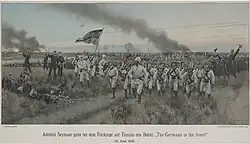 Early on Sunday morning, 17th June [1900], a week after we had started, the Taku Forts were taken by the Allied Forces in order to relieve Tientsin. That city was invested by the Boxers who began to bombard it next day. Of this of course we were quite ignorant. But the Court in Peking must have received instant news of the fact, for on the afternoon of the 18th Captain von Usedom, the German officer in command of the troops left at Langfang, was attacked by the Imperial forces belonging to General Tung-fuh-siang's division. Their numbers were estimated at 7,000 and they were well armed with modern rifles which they used with effect, so that we suffered considerable casualties.