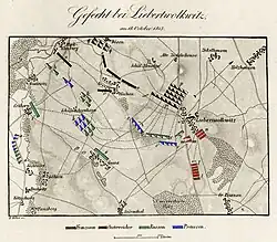 The Battle of Liebertwolkwitz (German: Schlacht von Liebertwolkwitz, also the battle of Güldengossat) took place on 14 October 1813 between French forces commanded by field marshal Joachim Murat and the Sixth Coalition's Allied Army commanded by Russian field marshal Peter Wittgenstein. It occurred around the village Liebertwolkwitz, a Saxony town south of Leipzig, two days before the start of the decisive battle of Leipzig. Clash is also referred as the biggest cavalry battle in military history with an approximate number of about 14,000 armed cavalrymen joining the both sides.[1]