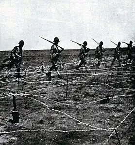 ![]() British Troops making their way through a wire entanglement during the battle. | |||||||
