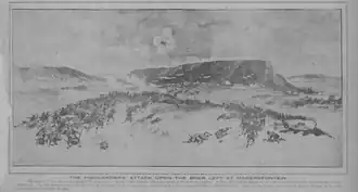 The Highlanders had advanced to within 400 yards (370 m) of the Boer trenches when the Boers opened fire; the British had no time to reform from their compact quarter columns into a fighting formation.[35] Wauchope instructed the brigade to extend its order, but in the face of such close-range Boer fire, the changing formation was thrown into disarray and confusion. General Wauchope was killed by almost the first volley, as was Lieutenant-Colonel G. L. J. Goff, the commanding officer of the Argylls.[36] The men at the head of the brigade disentangled themselves from the dead and most of them fled.[37] Some of the Black Watch at the head of the column charged the Boer trenches; a few broke through, but as they climbed Magersfontein Hill they were engaged by their own artillery and Boer parties, including one led by General Cronje himself, who had been wandering the kopje since 01:00,[38] and were subsequently killed or captured. Others were shot while entangled in the wire fence in front of the trenches.[3] Conan Doyle points out that 700 of the British casualties that day occurred in the first five minutes of the engagement.[39]