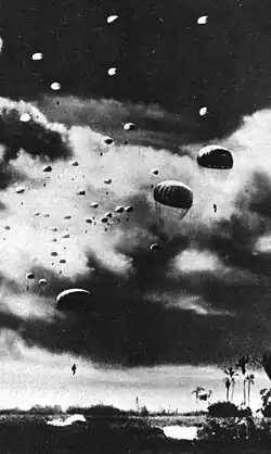 ![]() Japanese paratroopers dropping over Langoan Airfield. | |||||||