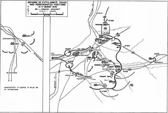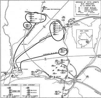 The Battle of Mutanchiang, or Battle of Mudanjiang, was a large-scale military engagement fought between the forces of the Union of Soviet Socialist Republics and the Empire of Japan from August 12 to 16, 1945, as part of the Harbin–Kirin Operation of the Soviet invasion of Manchuria in World War II. The rapid conclusion of the Manchurian campaign meant that this was one of the only set-piece battles that took place before the end of hostilities.[1] During the action, elements of the Japanese Fifth Army attempted to delay the Soviet Fifth Army and First Red Banner Army long enough to allow the bulk of the Japanese forces to retreat to more defensible positions.[19] Though casualties on both sides were heavy, the Red Army forces were able to break through the hastily organized Japanese defenses and capture the city ten days ahead of schedule. Nevertheless, the Japanese defenders at Mutanchiang achieved their goal of allowing the main forces to escape.[17]