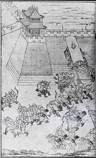 Jin forces assaulted the city from another side using reinforced siege carts while archers provided cover fire, hoping to draw out the defenders so that their "iron cavalry" could flank them. However, in addition to regular cannon shots, the defenders also launched poisonous bombs which prevented the Jin forces from advancing, and their siege carts were shot to pieces. Some managed to reach the walls, but the lines of saltpeter that the Ming had previously set up were ignited, creating a protective barrier of fire around the city. Following up Yuan sent forth a squad of "expendables" who finished off the rest of the siege carts. Meanwhile, the Jin were attacking another corner of the city but were repulsed by burning oil and incendiary attacks. Bed sheets covered in gunpowder and oil were dropped on them. Jin forces retreated that night.[8]
