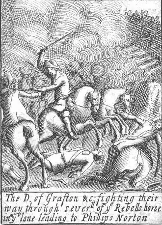 On the morning of 27 June, Monmouth's force broke camp and the majority of his troops began marching towards Frome. Only a portion of the rebels remained at Norton under personal command of Monmouth, serving as a rear-guard for the main force.[1] At 11 in the morning, the lead elements of Feversham's force, headed by Capt. Lloyd's Troop of Cavalry advanced down the laneway into the village and attacked the rebel barricade established by Capt. Vincent.[1] After a sharp fight, Lloyd withdrew his company to report back to Feversham and his commanders.