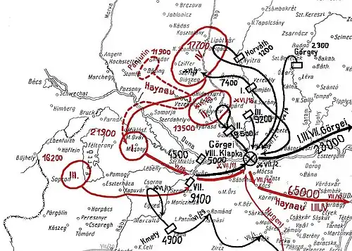 Görgei planned to attack as quickly as possible the Austrian troops on the Western Border of Hungary with the I., II., III., and parts of the VIII. corps, which were under the Central Operational Bureau's command, on the left Bank of the Danube, while the remainder of his troops had to protect the defensive line based on the Rába and Marcal rivers. Before the attack, he hoped that the 12,000 soldiers led by Józef Bem, coming from the southern front and Transylvania, promised by Kossuth to arrive to join his forces (unfortunately Bem refused to come, saying that this will leave Transylvania defenseless against the imminent Russian invasion).[13] The Hungarian armies at the beginning of the Summer Campaign consisted of 150,000 soldiers, 464 field, and 393 defensive (castle) cannons.[14]