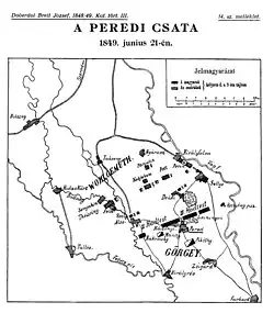 The Battle of Pered, fought on 20–21 June 1849, was one of the battles which took place in the Summer Campaign of the Hungarian War of Independence from 1848 to 1849, fought between the Hungarian Revolutionary Army and the Habsburg Empire helped by Russian troops. The Hungarian army was led by General[3] Artúr Görgei, while the imperial army by Lieutenant field marshal Julius Jacob von Haynau. After several preliminary minor battles of the Hungarian and Austrian troops along the Vág river, in which the attacking Hungarians could not achieve success, Görgei took the command of his troops, and after receiving reinforcements, on 20 June, put his troops to attack again towards West. Although the II. Hungarian army corps occupied in heavy fights the village of Pered, the other two corps (the III. and the VIII.) were unsuccessful, and could not advance. The angered Görgei removed the commander of the III. corps, General Károly Knezić because of his inactivity, and Colonel Lajos Asbóth, the commander of the II. corps who, in contrast to Knezić, was the only commander who accomplished his duties. While Knezić's place was taken by Colonel Károly Leiningen-Westerburg, who was a great choice, Asbóth's place was taken by Colonel József Kászonyi, who was an explicitly bad choice. Haynau, who on the first day of the battle was moving the bulk of his troops to cross the Danube to start an attack on its southern bank, sent three of his corps, which were still on the northern bank, to repel the Hungarian forces. The two Austrian (II., IV.) and one Russian (Fedor Panyutin's) corps started their attack on 21 June and forced the Hungarians to retreat from Pered and Zsigárd, which forced Görgei to order his troops to retreat from the battlefield.