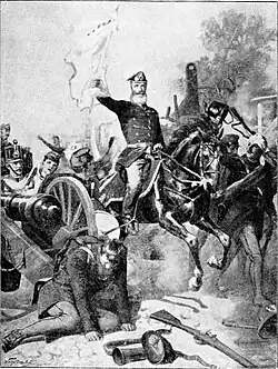 The superior Hungarian artillery won the duel with the Austrian cannons, then covered the infantries and cavalry's attack.[37] The Austrians tried to withstand the attack of the Hungarians, but when the Pozsony jäger company and the Bereg volunteer company occupied without much resistance Királyrév from the Austrian garrison,[27] while the 49. battalion attacked the right edge of Zsigárd, the 63. battalion entered it from the southwest, while the infantry of the Rakovszky detachment from the southeast the 58/1 Landwehr battalion, which was forced to retreat.[37] Noticing that the Hussars try to encircle Zsigárd, Pott gave the order to retreat towards Pered, which task was carried out in order.[37] But the 3. company of the Landwehr battalion which defended the eastern part of the village for too long, was encircled, and nearly all its soldiers fell prisoner.[37]