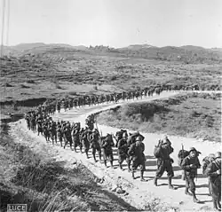 The Italians' plans became apparent on the night of 7 June, when their force began moving by road from Trikala to the village of Gortzi on the road to Petra.[18] At about 01:00 on 8 June, the telephone operator from Poliana informed ELAS command of the Italian movement, and the partisans were alerted to occupy their positions. The Italians arrived at Beletsi at 04:30.[17] In order to increase the psychological impact on the partisans, the Italian commander placed his cavalry in front, advancing at the double.[17]