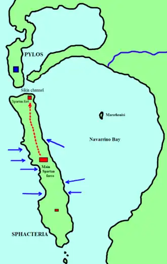 After the Battle of Pylos, which resulted in the isolation of over 400 Spartan soldiers on the island of Sphacteria, Sparta sued for peace, and, after arranging an armistice at Pylos by surrendering the ships of the Peloponnesian fleet as security, sent an embassy to Athens to negotiate a settlement.[2] These negotiations, however, proved fruitless, and with the news of their failure the armistice came to an end; the Athenians, however, refused to return the Peloponnesian ships, alleging that assaults had been made against their fortifications during the truce.[3] Hostilities resumed immediately, with the Athenians guarding the island night and day against attempts at rescue or resupply.