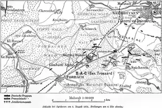 While the French army under General MacMahon engaged the German 3rd Army at the Battle of Wörth, the German 1st Army under Steinmetz advanced west from Saarbrücken. Early on the 6th,[7] a patrol from the German 2nd Army under Prince Friedrich Karl of Prussia spotted decoy fires ahead and saw Frossard's army farther off on a plateau south of the town of Spicheren. Ignoring Moltke's instructions, both German armies attacked Frossard's French II Corps fortified line.[8]