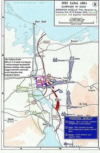 At 2:00 am, General Shmuel Gonen called Adan and asked him if he could capture Suez in the two to two and half hours between dawn and the ceasefire. Adan answered that it depended on the Egyptian defenses in the town, but that he thought that at least part of the town could be taken. Gonen said: "Okay, if it's Beersheba, go ahead; if it's Stalingrad, don't do it!", referring to Operation Yoav and the Battle of Stalingrad, respectively. Adan gave his orders accordingly.[10] Israel argued that the attack would not be a violation of the ceasefire if it was launched before 7:00 am, even if the battle continued after that hour, since the Arabs were the ones who chose when to start the war and when to call for a ceasefire. Israel also claimed that the ceasefire did not apply to "mopping up" operations that were altering the rear areas and not the front line. Intelligence knew of a commando battalion, two infantry battalions and an antitank missile company. Since Egyptian soldiers had been mostly surrendering during the previous two days, Adan assumed the defenders of Suez would not resist.[15]