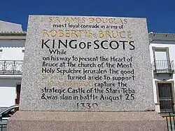 Le Bel relates that the Scots party remained at Sluys for twelve days, with Douglas holding court on board ship as if the late king were present.[4] Sir James' main purpose, according to Le Bel, was to publicise his mission and find out if other knights were interested in joining the Scots expedition to the Holy Land. It may be Douglas was awaiting news of the planned crusade against Granada and on learning that, despite the withdrawal of his allies, King Alfonso still intended to go to war, he finally set sail for Spain. After a stormy passage, the party arrived at the mouth of the Guadalquivir, probably sometime in late June, and disembarked upstream at Seville.[5]