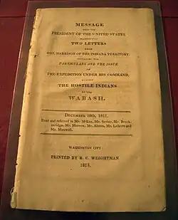 At first, newspapers carried little information about the battle, as they were focused on the highlights of the on-going Napoleonic Wars in Europe. An Ohio newspaper printed a copy of dispatches from Kentucky and characterized the battle as a defeat for the United States.[48] Shocked at the loss of Daveiss, well-known and liked, Kentucky papers criticized Harrison and one ran a front page lament for Daveiss. When the story was picked up in the east it was critical of Harrison, the Long Island Star writing, "Governor Harrison's account with the Indians, in general, is not very satisfying."[49]