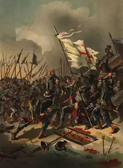 Pulgar justifies the defeat of the Isabelistas with the fact that the Prince's battle attacked as a block, while the Castilians were divided into six battles. So, each of them was successively beaten off without benefiting from the help of the others. Another factor cited by the same chronicler was "the great loss" suffered by the Castilians as a result of the fire from the many arquebusiers in the Prince's battle.[27] Zurita adds that the Prince successfully attacked with such "impetus" that the remaining men of the Castilian army became "disturbed".[2]