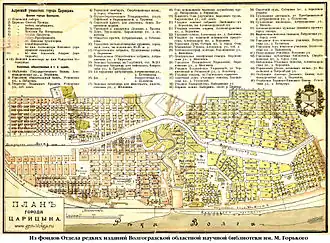 During the Russian Revolution, the heavily industrialized city of Tsaritsyn became a powerful revolutionary center.[2] The city, situated on the lower Volga, was of strategic importance for the Bolsheviks. It was through Tsaritsyn that the supplies of food and oil from Baku reached Moscow, and the railroad running through the city provided the Council of People's Commissars with supporters from Central Asia.[3] The city also played host to large ammunition factories.[4]