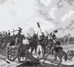 This heavy cavalry brigade, around 1,000 sabres strong, deployed on two lines, with the 3rd Herzog Albert Cuirassiers on the left and the 2nd Erzherzog Franz Cuirassiers on the right. D'Hurbal was suddenly charged by the 400 cavalrymen from the Saxon Prinz Klemens Chevaulegers regiment from Bernadotte's Corps, who had recklessly moved forward unsupported. D'Hurbal's cuirassiers stood to receive the charge and repulsed them by firing a pistol volley from 30 meters. This practice that was highly unusual for the cavalry tactics of the time but in this case it worked perfectly, with the Saxon chevaulegers sent fleeing. The Saxons then brought up the bulk of their cavalry, in echelon formation, with the right leading. D'Hurbal again chose to meet them with a pistol volley but this time the Saxons managed to maintain the impetus of their charge and crashed into the Austrian cuirassiers. Amongst the Saxon cavalry was a single squadron of the Herzog Albrecht Chevaulegers regiment, which shared the same Regimental Proprietor with the Austrian Herzog Albert cuirassiers and these units fought in a generalized melee that involved the entire cavalry present. After a few minutes, d'Hurbal's Austrians were beaten back and pursued, until they were rescued by Lederer's cuirassier brigade.[41] After this cavalry action, Prince Liechtenstein decided that he had lost too many men to no avail and consequently pulled the bulk of his forces back to safety, behind the Wagram-Gerasdorf line, leaving five cavalry regiments with the IV Korps at Markgrafneusiedl.[40]