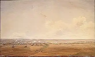 The Austrian commander thought that the battle scenario he had prepared for – a repetition of the battle fought at the end of May – was about to materialise, so he promptly moved his entire force to face the enemy. However, it soon became obvious that the French force was only a small detachment, sent forward to secure a bridgehead.[26] On 3 July, Archduke Charles finally decided not to fight the enemy near the Danube and retreated to the higher ground overlooking the Marchfeld. This was a major decision, as it meant that the earlier plan to man the 16 redoubts next to the Danube and fight the enemy there was abandoned. Instead, Archduke Charles occupied both the Bisamberg heights and the Wagram plateau behind the Russbach river, covering the retreat routes to Bohemia and Moravia respectively, thus occupying a sound strategic position. Although the army was not strong enough to occupy both positions and no earthworks were provided for the new position, it was thought that, given that the two heights were placed at an angle to one another, any enemy force attacking would find itself placed between two pincers.[27]