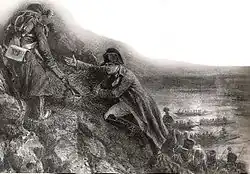 Meanwhile, an injured Masséna, leading his IV Corps from a conspicuous white phaeton, was also executing his orders and approaching the sector with three of his infantry divisions and his cavalry. In compliance with Napoleon's orders, Masséna's fourth infantry division, under General Boudet, had been left far to the south, defending the village of Aspern. The manoeuvre of IV Corps was hampered by the arrival of the leading battalions of the d'Aspré's division from the Austrian Grenadier Reserve, which delayed Masséna's rearguard division, under General Legrand. Arriving with his other two divisions in the vicinity of Aderklaa towards 07:30, Masséna was spotted by Napoleon, who got into the Marshal's phaeton to consult with him about the situation they were facing and, after a brief discussion, the Emperor ordered the recapture of Aderklaa. Masséna instructed General Carra Saint-Cyr to storm Aderklaa with his division and, seeing that the General delayed his action, trying to find a weak spot of the solid position, the Marshal hurried him forward for an immediate attack.[73]