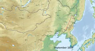 The Battle of Xicheng was a military conflict between the Yehe Jurchens, their Ming allies, and the Later Jin. In the fall of 1619 Nurhaci invaded Xicheng, the home of the Yehe Jurchens. Nurhaci personally led the vanguard and took the east wall. After capturing the city the Yehe inhabitants were spared, but their Ming allies who had fought beside them were executed.[1]