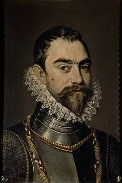 Leicester waited for the Spanish convoy near the small village of Warnsveld, half a mile from Zutphen.[4] Supported by the Earl of Essex, Sir John Norreys, Sir William Stanley, Lord Willoughby, his nephew the poet and courtier Sir Philip Sidney, and William Russell, Leicester commanded 1,500 infantry and 200 cavalry, according to the coeval English scholar Edward Grimeston.[4] Famiano Strada increases these numbers to 3,000 infantry and 400 cavalry,[14] and Alonso Vázquez to about 8,000, many of them veteran Frisons under Count William Louis of Nassau-Dillenburg.[13] The 19th-century American historian John Lothrop Motley, on the other hand, reduces the strength of the English force to 200 cavalry and 300 pikemen, though adding that "a much stronger force of infantry was held in reserve and readiness".[17] The English soldiers, unlike the Dutch, were anxious to engage the Spanish troops.[8] Rowland York told Leicester that he understood Spanish tactics, and that Spaniards were incomparable to English soldiers.[8]