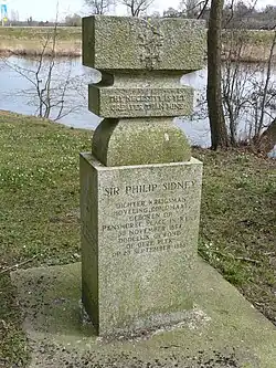 The Spanish soldier Alonso Vázquez labelled the Battle of Zutphen as "one of the best factions that until that time was ever seen in Flanders".[29] For many years it was common among Spaniards and Netherlanders to call a hard-fought action "as warm as the fight of Zutphen".[30] According to John Lothrop Motley, "it is probable that the encounter would have been forgotten by posterity but by the melancholy close up upon that field to Sidney's bright career".[30] Sidney allegedly had removed his cuisses when he saw that William Pelham was not wearing any.[31] However, by the 1590s cavalry soldiers wore less armour than in the past, and this, instead of Sidney's solidarity toward his companion, cost his life.[31] Sidney was carried to the town of Arnhem to recover, but he died three weeks later of gangrene, as surgeons were unable to extract the bullet.[32] Historians are uncertain about the number of casualties both sides suffered during the battle. Motley claims 13 horse and 22 foot killed on the English side, against 'perhaps' 200 men on the Spanish side.[1] On the other hand, Vázquez claimed that the Spanish "were winners with very little loss, having wounded and slaughtered many people to the rebels".[33]
