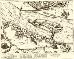 On 12 October, for the third time, Farnese supplied the garrison of Zutphen, personally, as he had done the first time. Later on, he sent Verdugo back to Friesland and left Johann Baptista von Taxis in charge of Zutphen. After that, the Spanish army took its winter quarters. When Farnese moved to Brussels to spend the winter there, the Earl of Leicester continued the siege of Zutphen.[34] He was not able to take the town, but succeeded in occupying several forts beyond the IJssel, including Zutphen's sconce, which was carried by surprise by Edward Stanley, brother of William Stanley, and 12 other soldiers.[34] Shortly after the English and Dutch also took their winter quarters. Sir William Stanley was given the command of Deventer, Sir John Burroughs of Doesburg, and Rowland York of Zutphen's sconce.[35] Stanley's and York's appointments were met with suspicion by the Dutch States, because Stanley was openly Catholic and York a man of dissolute character.[36] Leicester expressed his full confidence in both soldiers, but in 1587 Stanley and York shifted sides to the Spanish party and handed Deventer and Zutphen's sconce over to Taxis.[3]