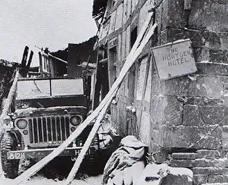 The 9th Infantry Division's ultimate objective were the Rur River crossings at Düren. On September 16, 1944, an attack by the 47th Infantry Regiment captured Schevenhütte,[14] on the northern fringes of the forest, with few casualties. The division had surprised the Germans, but lacked the strength to push on as two of their regiments were committed to the south. Attacks on and around the Höfen-Alzen ridge by the 39th and 60th Infantry Regiments were met with heavy resistance and pushed back. The 1st and 2nd Battalions of the 39th captured Lammersdorf, but could not dislodge enemies entrenched in the woods behind the village; the 3rd Battalion suffered heavy losses attacking Hill 554, near Lammersdorf. In these early engagements, the 9th Infantry Division was unable to eject the Germans from the periphery of the forest, and decided to push through it to the northeast and capture Hürtgen and Kleinhau. The engagement began on September 19, 1944. Repeated probes entered the forest toward their objective, but were beaten back by the terrain and Germans dug into prepared positions. On October 5, the 39th and 60th Infantry Regiments attacked towards the town of Schmidt while the 47th held a defensive position. The Monschau-Düren road was quickly cut, but both regiments were slowed by defenses and suffered significant casualties: The 60th's 2nd Battalion was reduced to a third after the first day. The 39th was halted at the Weisser Weh Creek; there were problems with narrow paths, air bursts in trees, and fire breaks which were blocked or enfiladed. Evacuation and supply was difficult or impossible. By 16 October, 3,000 yd (2,700 m) had been gained at the cost of 4,500 casualties. The U.S. 28th Infantry Division—a Pennsylvania National Guard unit—arrived the same day to relieve the battered 9th. Cota established his division command post in the village of Rott on 25 October and began coordination with the V Corps staff for future operations as his units began to occupy the 9th's positions north of Lammersdorf.[15][16]