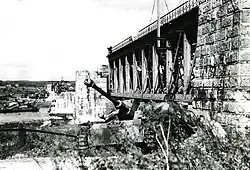 Before the offensive took place Model ordered both of Nijmegen's bridges to be destroyed so that allied reinforcements could be hindered. The British had already installed a strong anti-aircraft defence there. German Luftwaffe fighters launched many sorties to blow the bridges, but this was a costly failure - in one day forty-six fighters were lost to the RAF and anti-aircraft fire.[15] Instead, an attempt to blow the bridge by other means was sought. Frogmen from the German Marine Einsatzkommando said that they could attempt it. On 28 September, three groups of four German frogmen set off from 10 km upstream from the bridges to place explosives under them, and then to continue with the river current 24 km in an attempt to return to their lines.[16] The operation was a partial success - the railway bridge was blown up, a span managed to break away from a section & fell into the river making it totally unusable, but the road bridge was only slightly damaged because the mine had been badly placed. Of the twelve men, three were killed, seven were captured, and two managed to return to their lines.[17] The photo shows DUKW's from 536 Company RASC. The bridges however were repaired albeit temporarily - Royal Engineers were able to span a Bailey bridge both over the railway bridge and the damaged section of the road bridge.[18]