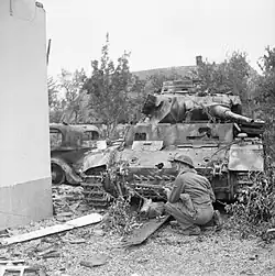 All German attacks on 1 October were repelled after bitter fighting.[1] During the night the Germans maintained their pressure and in the early hours of the following morning, a renewed assault hit the Irish Guards positions. Here the Germans used the unfinished causeway as their axis of advance, and in this second attack on Aam, the German infantry was supported by eight Panther tanks.[33] The Germans used flame throwers which overran a few forward positions – a seventeen pounder was knocked out, but in return three German tanks were destroyed – one by a PIAT, another by a Sherman and a third by a 17 pounder.[27] Again the German attack was a complete failure.[34]