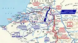 Three Army Corps were involved: the II Fallschirmjäger Korps to the east of Nijmegen, the II SS Panzer Korps on the Island and the XII SS korps. The latter operated from the north bank of the Nederrijn west of Arnhem and the south bank near Kesteren and Ochten, the area where the two rivers the Nederrijn and Waal approached to within a few miles of each other. These three army Corps were to launch coordinated attacks that intended to cut off the Allied concentration at Nijmegen through the south of the Waal and Nijmegen, from Groesbeek to the Maas-Waal Canal. II Fallschirm Korps would launch a converging attack north of the Waal against the Nijmegen bridgehead from the east and west of II SS Panzer and XII SS korps respectively.[12] There was also a plan to destroy the Nijmegen road bridge in the hope that it would hamper Allied supplies and reinforcements. Hitler on the news of the failure of its destruction during its capture by the allies ordered an inquiry.[11]