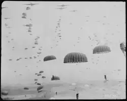 By the early hours of 5 October the 43rd Wessex handed over their positions to the 506th Parachute Infantry Regiment of the US 101st Airborne Division brought up from Eindhoven – they had no heavy artillery themselves but were supported by British artillery units, the 43rd Wessex anti-tank and mortar platoons, elements of the Duke of Cornwall Light Infantry, as well as the divisional reserve.[52] One of the most difficult handovers was with the 1st Dorsets near Driel who were under a continual bombardment and in close proximity with the 116th Panzer Division. That evening another German attack reached the wooded area west of the embankment, and part of this force infiltrated between 'C' and 'D' Coys. After bitter fighting the Germans were thrown back losing some 36 POWs before the Dorsets under great difficulty handing over to the Americans. During the handover the 101st Airborne's commander, Major General Maxwell Taylor, was injured in the backside.[53]