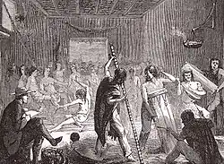 Batuques, or drumming ceremonies were an important cultural activity among the African population. These performance circles were a regular occurrence on Sunday evenings and holidays, drawing large crowds of enslaved Africans.[2] Laws introduced in 1822 allowed police to shut down batuques.[3] Despite the police repression, the batuques persisted covertly at the town's outskirts or along the shoreline.[4]
