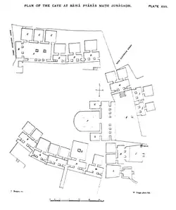The Bava Pyara caves were visited by James Burgess, an English archaeologist and founder of The Indian Antiquary. He concluded that they have affiliated with both Buddhism and Jainism. According to Burgess these caves were initially built for Buddhists bhikkhus and were in a later period occupied by Jain ascetics. He was not certain about the exact age of the ancient caves. One fragmentary inscription was found in the Bava Pyara cave that affirms its affiliation to Jainism because one term in that inscription is exclusively used by Jains. The inscription was read as "केवलज्ञान संप्राप्तानां जीतजरामरणानां ".[1][2][3]
