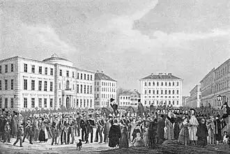 Tensions between the Greek and Bavarian officers increased during the period, and reached a boiling point in 1842: during the annual celebration for the start of the War of Independence on 25 March, the Greek artillery officers in Nafplion publicly demanded the removal of the remaining foreign volunteers. The Bavarian commander of the artillery imposed a 20-day prison sentence on them, which caused an uproar in the press. The government quickly quashed the sentence, but reassigned the protesting officers to other garrisons, while the commander remained in place.[31] 181 Bavarian officers remained in the army lists until the 3 September 1843 Revolution that introduced constitutional government and ended the Bavarian domination of the army by dismissing all foreigners apart from the "old Philhellenes" who had fought in the War of Independence.[32][33]